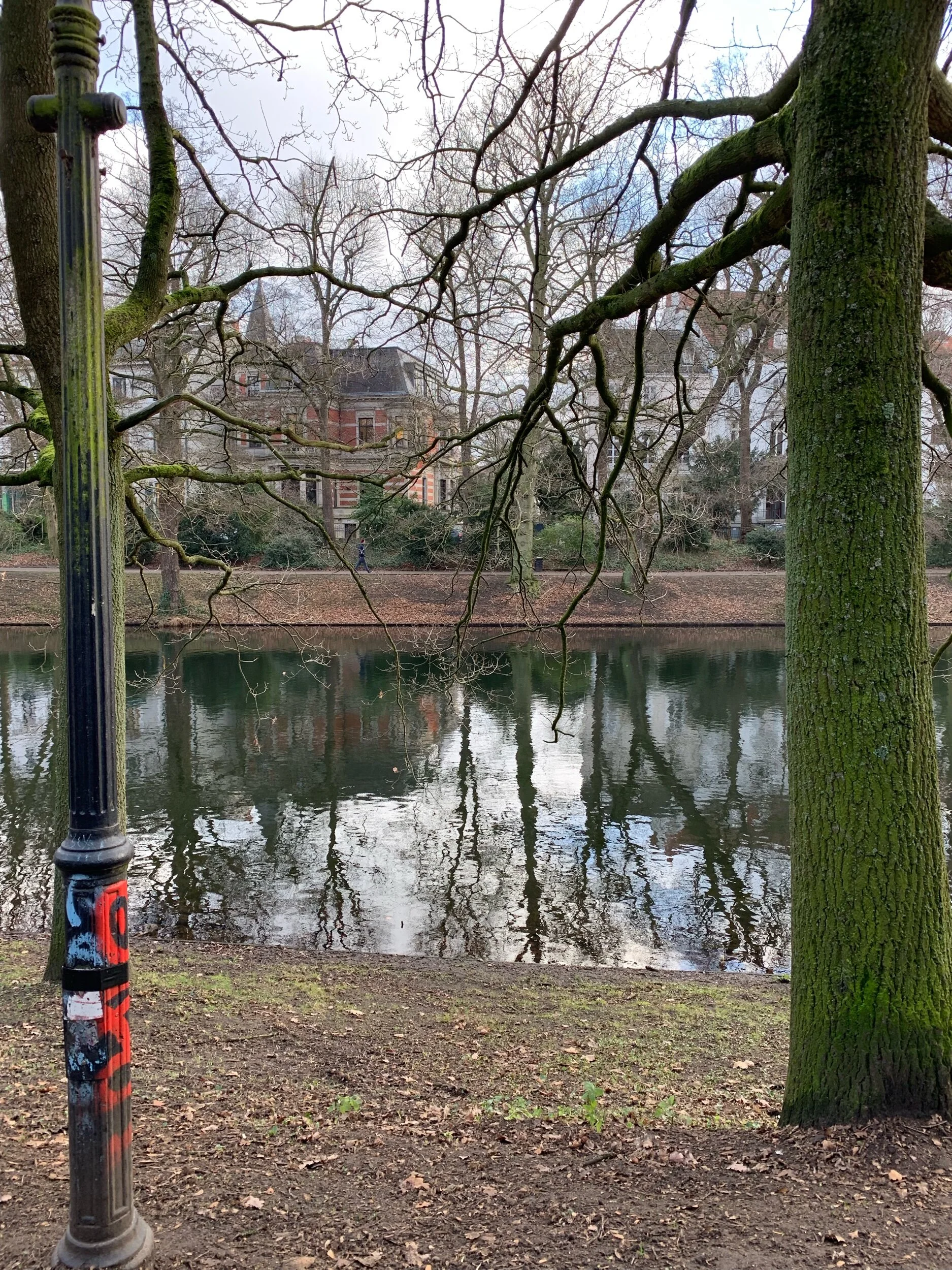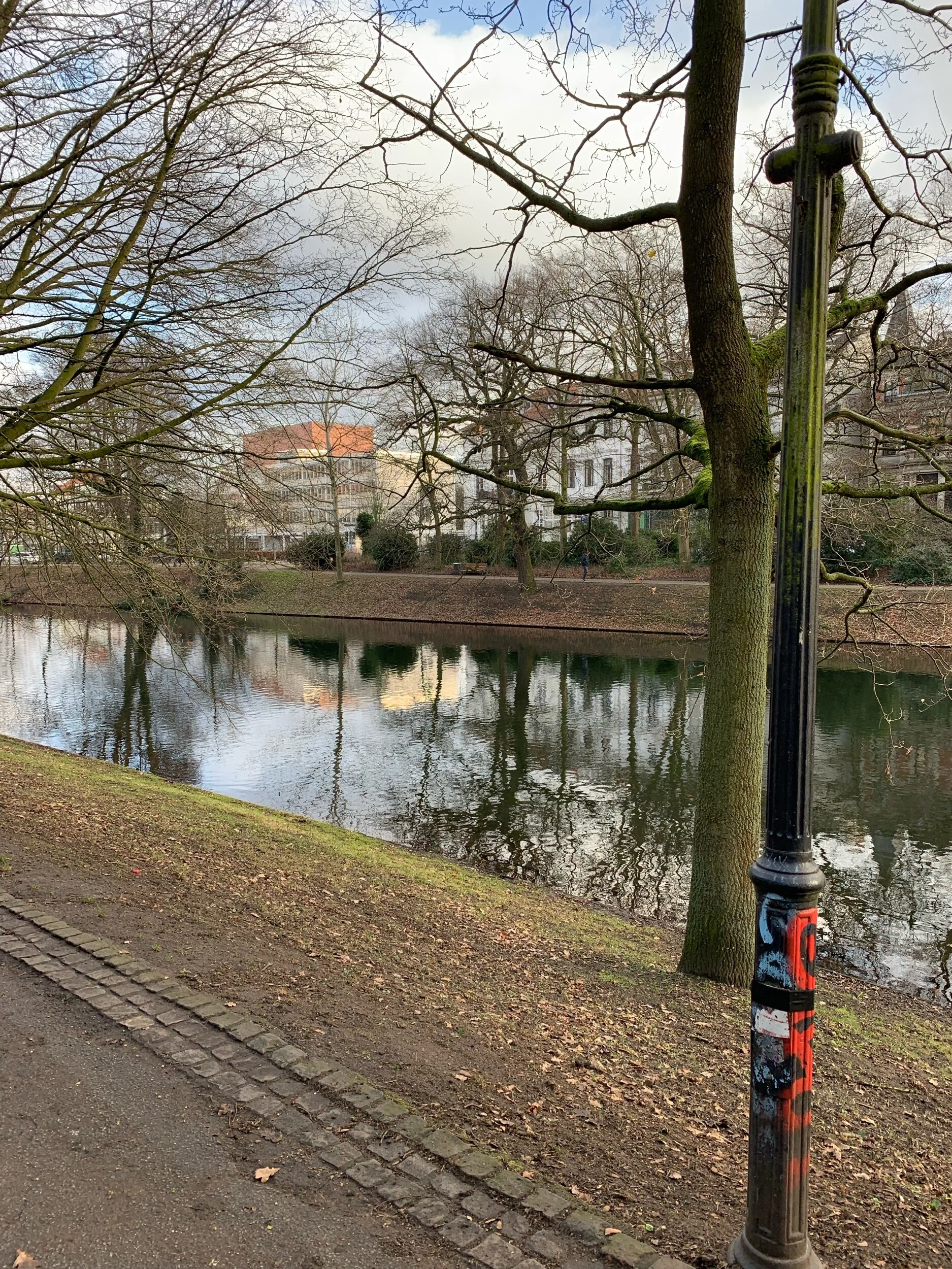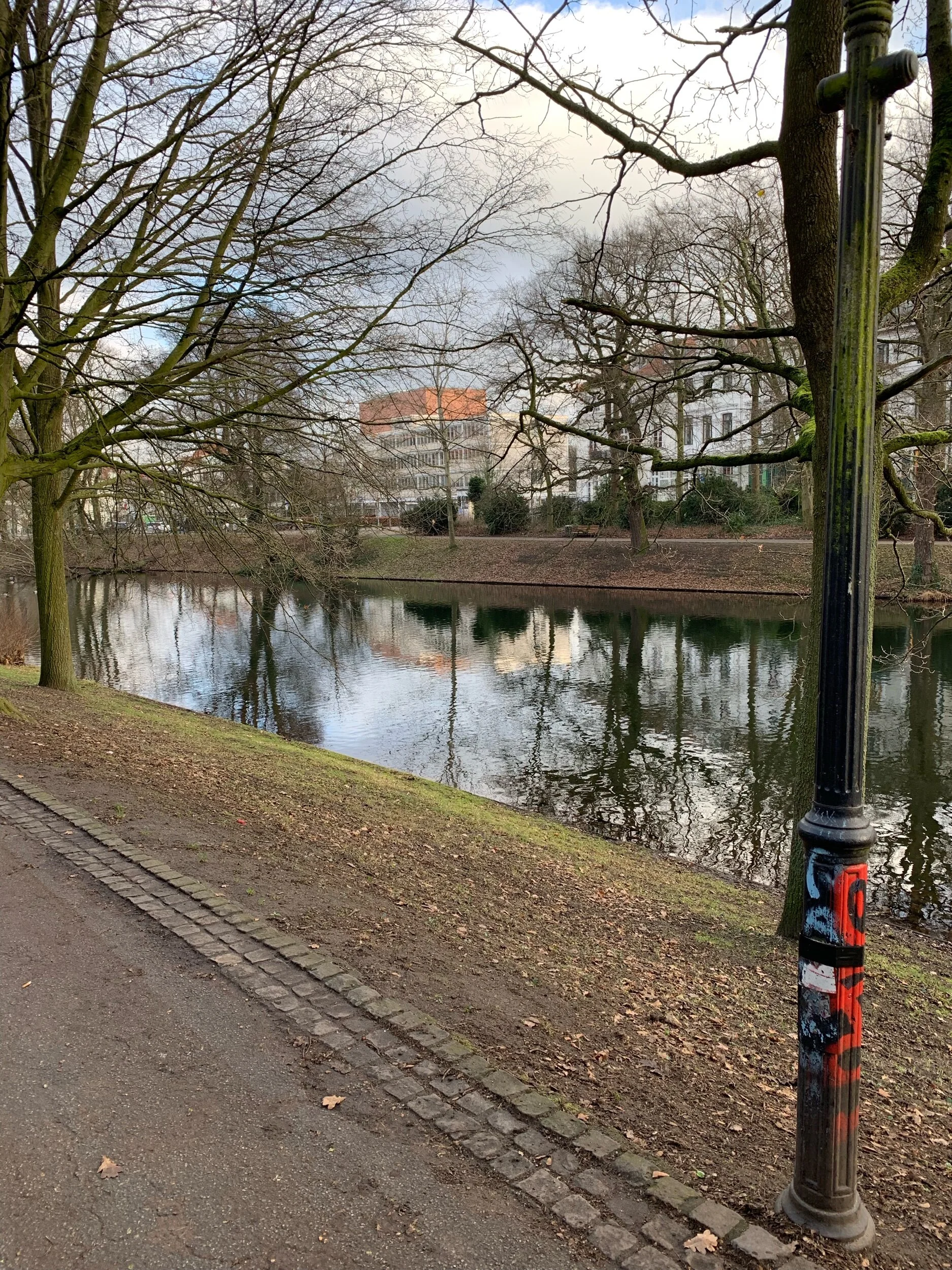 Für ein kleines Experiment stehe ich in den Bremer Wallanlagen direkt vor einem Laternenmast, der einen wenige Meter dahinter stehenden Baum verdeckt.