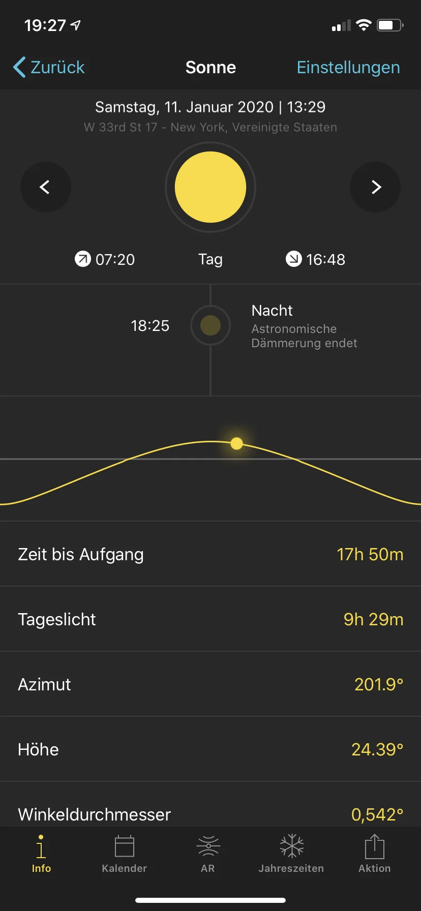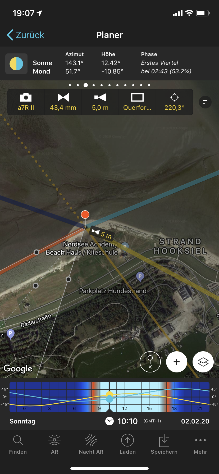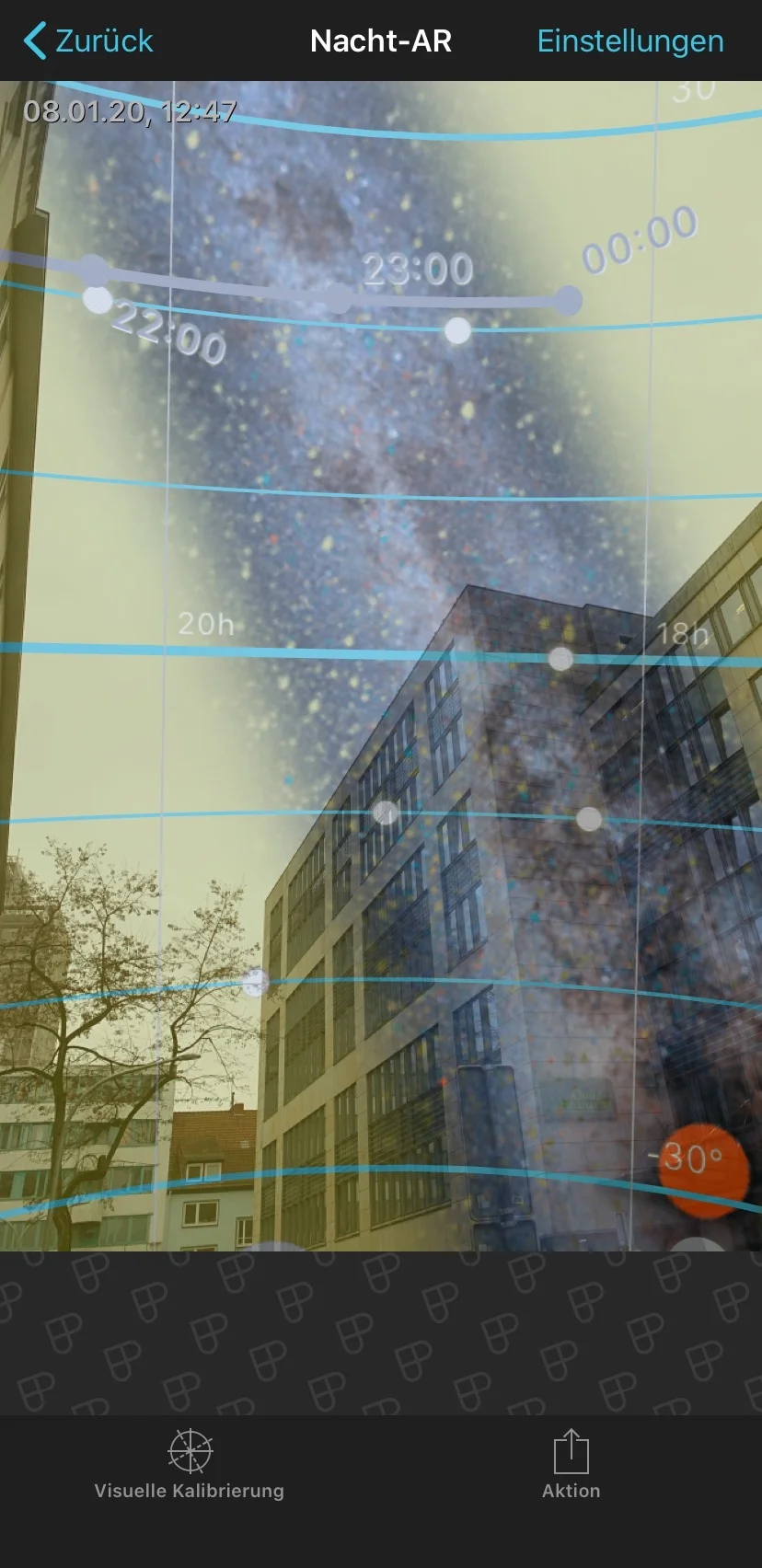 Wenn Du Dich mit Deinem Handy bereits am geplanten Standort befindest, kannst Du Dir per Augmented Reality unter anderem die genaue Bahn der Sonne oder des Mondes und die Position der Milchstraße an jedem beliebigen Datum über der realen Szenerie anzeigen lassen.